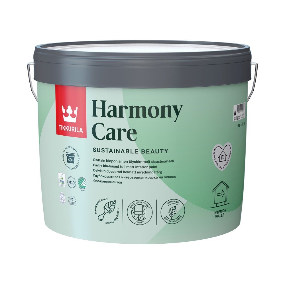 Produktas: Vandeniniai biologinės kilmės vidaus dažai TIKKURILA, Harmony Care, 9 l, A bazė, visiškai matiniai