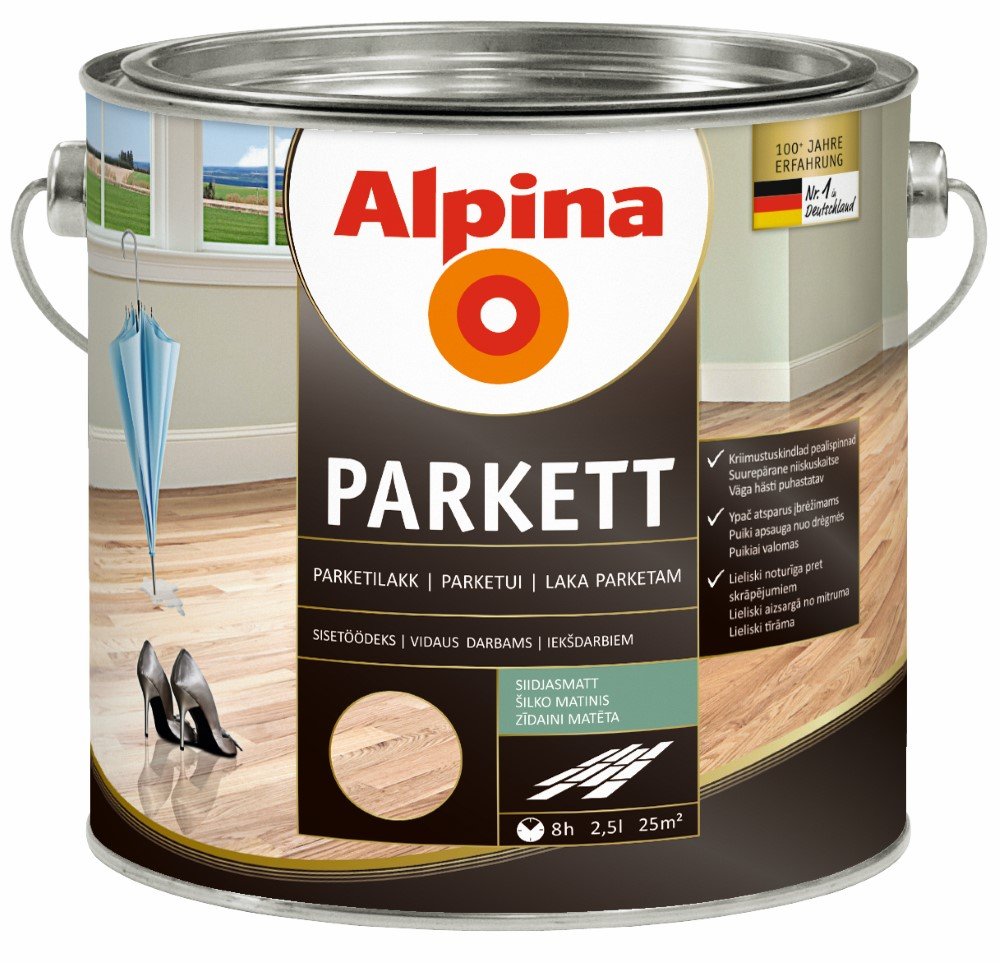 Produktas: Alkidinis parketo lakas ALPINA Parkettlack Seidenmatt, 2,5 l, šilko matinis, skaidrus, skirtas medinėms grindims