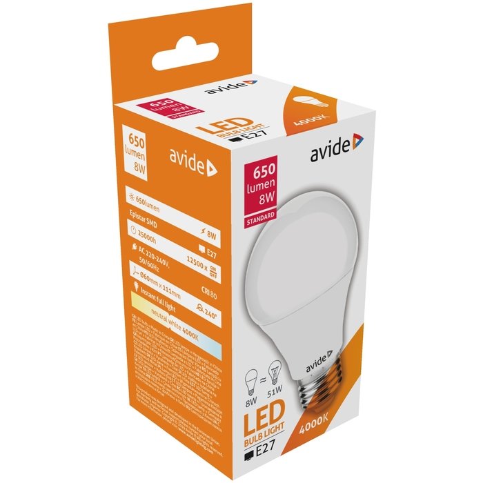 Produktas: LED lempa AVIDE At-4940, 8W (=51W), E27 A60, NW, 4000K, 220-240V, 650 lm, 25.000 val.
