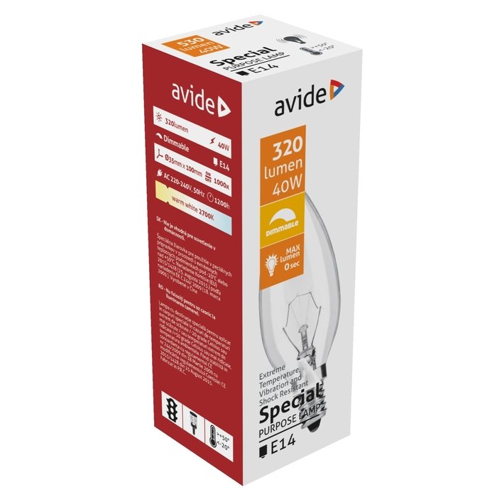 Kaitrinė pramoninio naudojimo lempa AVIDE, E14 C35, žvakė, 40W, AT-7406, skirta pramoniniams tikslams, netinka naudoti buityje