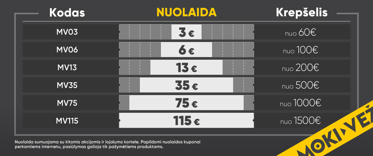 - Pažymėtoms prekėms lojalumo nuolaida sumuojasi kartu su kuponų nuolaidomis.